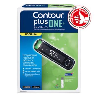 Контур Плюс Уан (Contour Plus One) — инновационный глюкометр последнего поколения, который позволяет увидеть Ваш диабет в новом свете. Высокая точность измерений. Умная ПОДСВЕТКА (smartLIGHT) — упрощает интерпретацию результатов с первого взгляда. Поможет избежать ошибок при определении, находится ли уровень глюкозы в пределах, выше или ниже целевого диапазона. Технология «Второй шанс» — возможность в течение 60 секунд дополнительно нанести кровь на тест-полоску в случае ее недозаполнения. Беспроводная передача данных через Bluetooth в мобильное Приложение Контур Диабитис (CONTOUR DIABETES), установленное на смартфоне. Приложение автоматически представляет результаты измерений уровня глюкозы в простом и удобном для просмотра виде. Возможность добавлять дополнительную информацию к показаниям глюкозы крови в Приложении Контур Диабитис (CONTOUR DIABETES) — еда, физическая нагрузка, лекарственные препараты, примечания или фотографии и анализировать полную картину самоконтроля с врачом на приеме. Интеграция с бесплатным мобильным приложением CONTOUR DIABETES. Легко читаемый дисплей с ночной подсветкой. Память позволяет сохранить 800 последних результатов измерений (это более чем 6 месяцев записей при средней частоте измерений 4 раза в день). При хранении данных в облаке возможно сохранять неограниченное количество показаний. Стильный эргономичный дизайн прибора. Возможность через Приложение подготовить и отправить детализированный отчет врачу. Безопасная учетная запись в облаке позволяет синхронизировать показания с нескольких глюкометров Контур Плюс Уан для одного пользователя. Система использует тест-полоски Контур Плюс ( Contour Plus). В тест-полоске используется современный фермент ФАД-ГДГ, который практически не имеет взаимодействия с лекарствами, что обеспечивает точные измерения при приеме, например, парацетамола, аскорбиновой кислоты/витамина С4. Глюкометр выполняет автоматическую коррекцию результатов измерений при гематокрите от 0 до 70% — это позволяет получать высокую точность при широком диапазоне гематокрита, который может быть понижен или повышен в результате различных заболеваний.