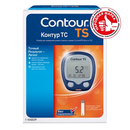 Глюкометр Контур ТС — это прибор для измерения уровня глюкозы в крови, измерение происходит за 8 секунд. Прибор имеет крупный жидкокристаллический экран размером 33х25 мм, встроенную память на 250 результатов. Глюкометр Контур ТС использовать только с тест-полосками Контур ТС. Ланцеты для прокалывания предназначены для индивидуального тестирования только одного человека. Функциональные особенности: Технология «Без кодирования» снижает количество этапов тестирования шаги и погрешности, связанные с введением неправильного кодаъ Маленькая капля крови, необходимая для анализа — 0,6 мкл Короткое время, необходимое для анализа крови — 8 секунд Хорошо видимый оранжевый порт для введения тест-полоски Точность измерения при широком диапазоне гематокрита (0-70%) Отсутствие влияния мальтозы на результат анализа Возможность тестирования в альтернативных участках Запоминание 250 последних результатов тестирования Результаты тестирования можно загружать в программное обеспечение Bayer’s Diabetes Management Характеристики: Метод измерения – электрохимический. Количество крови для анализа – 0,6 мкл. Время проведения анализа – 8 секунд. Кодировка – автоматическая. Питание глюкометра – 1 батарейка типа CR2032 – ресурса хватает на примерно 1000 замеров. Память – 250 анализов с отображением времени. Есть возможность подключения к компьютеру. Физические размеры – 70 на 60 на 20 мм. Масса – 58 граммов вместе с батарейкой.