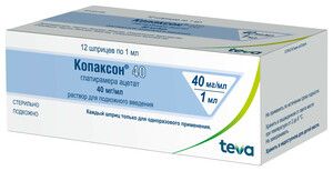 Показания к применениюРемиттирующерецидивирующий рассеянный склероз.Применение при беременности и кормлении грудьюБеременностьИсследования на животных не выявили репродуктивной токсичности. В доклинических исследованиях у крыс и кроликов получавших глатирамера ацетат путем подкожной инъекции в течение периода органогенеза неблагоприятных эффектов на развитие эмбриона-плода не наблюдалось при введении в дозах до 37 5 мг/кг/день. У крыс получавших подкожно глатирамера ацетат в дозах до 36 мг/кг с 15 дня беременности существенного влияния на роды или на рост и развитие потомства не установлено.Большинство данных о применении глатирамера ацетата у беременных женщин касались препарата в дозировке 20 мг/мл который вводили подкожно один раз в день. Опыт применения препарата у беременных женщин указывает на отсутствие мальформативной или фетальной/неонатальной токсичности. В настоящее время отсутствуют соответствующие эпидемиологические данные. Отсутствуют также адекватные и хорошо контролируемые исследования у беременных женщин. Поскольку исследования на животных не всегда могут предсказать реакции у человека препарат не следует использовать во время беременности за исключением случаев когда ожидаемая польза для матери превосходит потенциальный риск для плода.Период грудного вскармливанияНеизвестно выделяются ли глатирамера ацетат или его метаболиты в материнское молоко. Однако у крыс получающих ежедневно подкожно глатирамера ацетат в дозах до 36 мг / кг начиная с 15-го дня беременности на протяжении всего периода кормления грудью не установлено существенного влияния на рост и развитие потомства. Риск для новорожденных / младенцев не может быть исключен. Необходимо принять решение либо о прекращении грудного вскармливания либо о прекращении терапии препаратом Копаксон® 40 с учетом пользы грудного вскармливания для ребенка и пользы терапии для женщины.ПротивопоказанияГиперчувствительность к глатирамера ацетату или маннитолу детский возраст до 18 лет (эффективность и безопасность не изучены).СоставВ 1 мл раствора содержится: действующее вещество: глатирамера ацетат 40 0 мг вспомогательные вещества: маннитол 40 0 мг вода для инъекций 944 мг.Взаимодействие с другими препаратамиВзаимодействие между препаратом Копаксон® 40 и другими лекарственными средствами отдельно не оценивалось. Нет данных о взаимодействии с интерфероном бета.Выявлено увеличение случаев реакций в месте инъекций при одновременном введении препарата Копаксон® 40 с глюкокортикостероидами.В исследовании in vitro было сделано предположение что глатирамера ацетат имеет высокий уровень связывания с белками плазмы крови и не вытесняется из указанной связи самостоятельно а также на фоне использования фенитоина или карбамазепина. Тем не менее поскольку препарат Копаксон® 40 обладает потенциальным воздействием на протеин-связывающие вещества необходимо контролировать его одновременное применение с другими лекарственными препаратами.