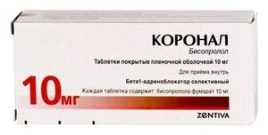 Показания к применению— артериальная гипертензия; — ИБС: профилактика приступов стенокардии.Применение при беременности и кормлении грудьюПри беременности Коронал назначают только по строгим показаниям в случае, если предполагаемая польза для матери превышает потенциальный риск для плода. За 72 ч перед родами прием препарата Коронал необходимо прекратить в связи с возможным развитием у плода/новорожденного брадикардии, артериальной гипотензии, гипогликемии и угнетения дыхания. Если прием препарата Коронал необходим в период лактации, грудное вскармливание необходимо прекратить. При приеме бисопролола при беременности у плода возможна внутриутробная задержка роста, гипогликемия, брадикардия.Противопоказания— шок (в т.ч. кардиогенный); — острая сердечная недостаточность; — хроническая сердечная недостаточность в стадии декомпенсации; — AV-блокада II и III степени (без искусственного водителя ритма); — синоатриальная блокада; — СССУ; — выраженная брадикардия; — кардиомегалия (без признаков сердечной недостаточности); — артериальная гипотензия (систолическое АД ниже 100 мм рт.ст., особенно при инфаркте миокарда); — бронхиальная астма и хроническая обструктивная болезнь легких в анамнезе; — одновременный прием ингибиторов МАО (за исключением ингибиторов МАО типа В); — сопутствующее применение флоктафенина и сультоприда; — поздние стадии нарушения периферического кровообращения; — болезнь Рейно; — период лактации; — возраст до 18 лет (эффективность и безопасность не установлены); — повышенная чувствительность к компонентам препарата и другим бета-адреноблокаторам. С осторожностью следует назначать препарат при печеночной недостаточности, почечной недостаточности (КК менее 20 мл/мин), метаболическом ацидозе, феохромоцитоме (при сопутствующем применении альфа-адреноблокаторов), сахарном диабете в стадии декомпенсации, AV-блокаде I степени, стенокардии Принцметала, рестриктивной кардиомиопатии, врожденных пороках сердца или пороках клапанов сердца с выраженными гемодинамическими нарушениями, хронической сердечной недостаточности с инфарктом миокарда в течение последних 3 месяцев, псориазе, депрессии (в т.ч. в анамнезе), тяжелых аллергических реакциях в анамнезе, при беременности, при соблюдении строгой диеты, проведении десенсибилизирующей иммунотерапии аллергенами и экстрактами аллергенов, а также пациентам пожилого возраста.СоставБисопролола фумарат 5 мг Вспомогательные вещества: целлюлоза микрокристаллическая — 133 мг, крахмал кукурузный — 7.5 мг, натрия лаурилсульфат — 1 мг, кремния диоксид коллоидный — 2 мг, магния стеарат — 1.5 мг. Состав пленочной оболочки: гипромеллоза — 6.4 мг, макрогол 400 — 1.28 мг, титана диоксид — 2.3 мг, краситель железа оксид желтый (Е172) — 0.02 мг.