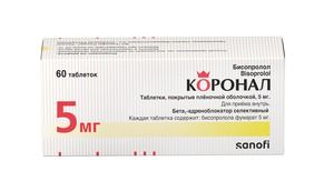 Показания к применению- артериальная гипертензия;- ИБС: профилактика приступов стенокардии.Применение при беременности и кормлении грудьюПри беременности Коронал назначают только по строгим показаниям в случае, если предполагаемая польза для матери превышает потенциальный риск для плода. За 72 ч перед родами прием препарата Коронал необходимо прекратить в связи с возможным развитием у плода/новорожденного брадикардии, артериальной гипотензии, гипогликемии и угнетения дыхания.Если прием препарата Коронал необходим в период лактации, грудное вскармливание необходимо прекратить.При приеме бисопролола при беременности у плода возможна внутриутробная задержка роста, гипогликемия, брадикардия.Противопоказания- шок (в т.ч. кардиогенный);- коллапс;- отек легких;- острая сердечная недостаточность;- хроническая сердечная недостаточность в стадии декомпенсации;- AV-блокада II и III степени;- синоатриальная блокада;- СССУ;- выраженная брадикардия;- ангиоспастическая стенокардия (стенокардия Принцметала);- кардиомегалия (без признаков сердечной недостаточности);- артериальная гипотензия (систолическое АД ниже 100 мм рт.ст., особенно при инфаркте миокарда);- бронхиальная астма и хроническая обструктивная болезнь легких в анамнезе;- одновременный прием ингибиторов МАО (за исключением ингибиторов МАО типа В);- поздние стадии нарушения периферического кровообращения;- болезнь Рейно;- феохромоцитома (без одновременного использования альфа-адреноблокаторов);- метаболический ацидоз;- возраст до 18 лет (эффективность и безопасность не установлены);- повышенная чувствительность к компонентам препарата и другим бета-адреноблокаторам.СоставДействующее вещество: Бисопролола фумаратКонцентрация действующего вещества (мг): 5