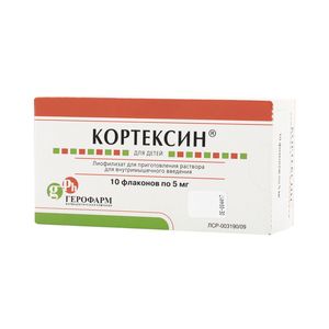 Показания к применениюНейроинфекции (бактериального и вирусного характера), нарушение мозгового кровообращения, черепно-мозговая травма, энцефалопатии различной этиологии, астенический синдром, в комплексной терапии энцефалита и энцефаломиелита (острые и хронические формы), эпилепсия (в составе комплексной терапии), надсегментарные вегетативные расстройства, нарушение мышления, памяти, снижение способности к обучению, детский церебральный паралич, задержка речевого и психомоторного развития в детском возрастеПрименение при беременности и кормлении грудьюПрепарат противопоказан к применению при беременности (из-за отсутствия данных клинических исследований).При необходимости назначения препарата в период лактации следует прекратить грудное вскармливание (из-за отсутствия данных клинических исследований).ПротивопоказанияВ случае указаний в анамнезе на аллергические реакции к кортексину и другим компонентам препарата.Побочное действиеСледующие нежелательные реакции, наблюдавшиеся во время клинического применения, перечислены ниже в соответствии с системно-органной классификацией, в порядке убывания частоты возникновения: очень часто (≥1/10); часто (≥1/100, но <1/10); нечасто (≥1/1000, но <1/100); редко (≥1/10000, но <1/1000); очень редко (<1/10000). Системно-органная классификация Очень редко Со стороны иммунной системы Анафилактический шок, гиперчувствительность к лекарственному препарату Со стороны кожи и подкожной клетчатки Ангионевротический отек, эритема, крапивница, сыпь, зуд, дерматит аллергический Со стороны нервной системы Психомоторное возбуждение, нарушение координации движений, головная боль, головокружение, сонливость, гипестезия Со стороны сердца Тахикардия (увеличение частоты сердечных сокращений), аритмия Нарушения психики Ощущение тревоги, бессонница Общие расстройства и нарушения в месте введения Гиперемия в месте введения, гипертермия, астения, озноб Лабораторные и инструментальные данные Повышение АД СоставДействующее вещество: кортексин (комплекс водорастворимых полипептидных фракций)Концентрация действующего вещества (мг): 5 мгВзаимодействие с другими препаратамиЛекарственное взаимодействие препарата Кортексин не описано.