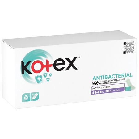 Kotex® Antibacterial (Антибактериал) – это абсолютная инновация в категории ежедневных прокладок! Новые ежедневные прокладки от Kotex® созданы специально для потребностей современных девушек, которые хотят быть уверены в своей защите и отсутствии неприятного запаха. Благодаря наличию специального антибактериального слоя внутри прокладки новые Kotex® Antibacterial обеспечивают 99% защиту от роста бактерий* и контроль запаха: компоненты антибактериального слоя воздействуют на бактерии, вызывающие неприятный запах, не давая им размножаться. Антибактериальный слой находится внутри прокладки, не соприкасаясь с V-зоной и не воздействуя на неё.