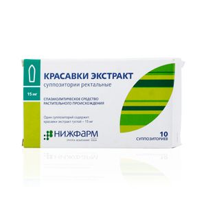 Показания к применениюДля системного применения: спазмы гладкомышечных органов ЖКТ, желче- и мочевыводящих путей, гиперсекреторный гастрит, язвенная болезнь желудка и двенадцатиперстной кишки, панкреатит, гиперсаливация, отравления солями тяжелых металлов, м-холиномиметиками, антихолинэстеразными средствами, обструктивный бронхит, бронхиальная астма, премедикация перед оперативными вмешательствами, брадиаритмии, AV-блокада, предупреждение остановки сердца и бронхоспазма при наркозе.Для местного применения в офтальмологии: для исследования глазного дна, для лечения ирита, иридоциклита, хориоидита, кератита, эмболии и спазма центральной артерии сетчатки, некоторых травм глаза.Применение при беременности и кормлении грудьюПрименение красавки при беременности возможно только в том случае, когда предполагаемая польза для матери превышает потенциальный риск для плода. В период лактации (грудного вскармливания) применение красавки противопоказано.ПротивопоказанияГлаукома, подозрение на глаукому, стенозирующие заболевания ЖКТ, атония кишечника, острый язвенный колит, механическая кишечная непроходимость, атонические запоры, доброкачественная гиперплазия предстательной железы, резко выраженный атеросклероз, острый отек легких, декомпенсация сердечной деятельности, тахиаритмия, острые кровотечения, миастения, лактация, повышенная чувствительность к красавке.Побочное действиеПри системном применении: возможны головная боль, нервозность, сонливость, слабость, головокружение, расстройства сна, атаксия, нарушение речи, возбуждение (особенно у пожилых пациентов), сухость во рту, потеря вкуса, потеря аппетита, запор. При передозировке: тошнота, рвота, тахикардия, тахиаритмия, ишемия миокарда, импотенция, подавление лактации, идиосинкразия, крапивница, снижение потоотделения, гипертермия. При местном применении: нарушения зрения, мидриаз, паралич аккомодации, повышение внутриглазного давления, фотофобия.Состав1 супп. содержит:Активное вещество: густой экстракт красавки 15 мг.Взаимодействие с другими препаратамиКрасавка уменьшает или устраняет действие м-холиномиметиков, антихолинэстеразных средств. Потенцирует аритмогенное действие ингибиторов МАО, сердечных гликозидов, клонидина, холинолитические свойства хинидина, новокаинамида, эффекты барбитуратов, адреномиметиков, антигистаминных препаратов, транквилизаторов. С ацетатом свинца, солями кальция, танином, настойкой ландыша образует осадок.