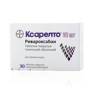 Круглые двояковыпуклые таблетки розового цвета покрытые пленочной оболочкой; методом выдавливания нанесена гравировка: на одной стороне — треугольник с обозначением дозировки (10), на другой — фирменный байеровский крест. Вид таблеток в изломе: однородная масса белого цвета, окруженная оболочкой розового цвета.