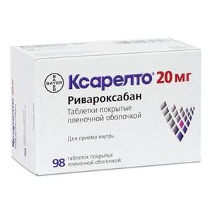 Таблетки 20 мг: круглые, двояковыпуклые таблетки красно-коричневого цвета, покрытые пленочной оболочкой, методом выдавливания нанесена гравировка: на одной стороне — треугольник с обозначением дозировки «20», на другой — фирменный байеровский крест.Характеристика препарата:Механизм действияРивароксабан — высокоселективный прямой ингибитор фактора Ха, обладающий высокой биодоступностью при приеме внутрь.Активация фактора Х с образованием фактора Ха через внутренний и внешний пути свертывания играет центральную роль в коагуляционном каскаде, что приводит к формированию фибринового тромба и активации тромбоцитов тромбином. Ривароксабан не ингибирует тромбин (активированный фактор П), а также не продемонстрировал влияния на тромбоциты.