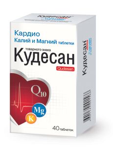 Кардио Калий и магний товарного знака Кудесан таблетки — является источником Q10, калия и магния, которые оказывают разностороннее влияние на деятельность сердца: — поддерживают нормальную работу миокарда: коэнзим Q 10 снабжает сердце энергией и защищает от воздействия свободных радикалов, а калий и магний необходимы для нормального сокращения сердечной мышцы и проводимости нервных импульсов, — участвуют в профилактике заболеваний сердечно-сосудистой системы за счет того, что питают сердечную мышцу, и кроме того: коэнзим Q 10 замедляет процессы старения и препятствует развитию атеросклероза, калий и магний укрепляют сердечную мышцу, поддерживают эластичность сосудов.