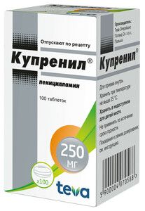 Показания к применениюБолезнь Вильсона-Коновалова, отравления медью, неорганическими соединениями ртути, свинца (при исключении дальнейшего попадания свинца через ЖКТ), золота, цинка, железа, цистиновый нефролитиаз, системная склеродермия, ревматоидный артрит.Противопоказания— повышенная чувствительность к пеницилламину и другим компонентам препарата— беременность и период кормления грудью (за исключением болезни Вильсона-Коновалова в дозе до 1 г/сут)— агранулоцитоз— почечная недостаточность— нарушения гемопоэза— детский возраст до 3-х лет (для данной лекарственной формы).Не следует применять в комбинации с препаратами золота аминохинолиновыми и цитостатическими препаратами фенилбутазоном.Побочное действиеАнорексия, тошнота, рвота, диарея, афтозный стоматит, глоссит внутрипеченочный холестаз, панкреатит кожная сыпь эпидермальный некролиз полная потеря или искажение вкусовых ощущений, обратимый полиневрит (связано с дефицитом пиридоксина) нефрит, гематурия эозинофилия, тромбоцитопения, лейкопения анемия (апластическая или гемолитическая), агранулоцитоз аллергический альвеолит, интерстициальный пневмонит, диффузный фиброзирующий альвеолит, синдром Гудпасчера миастения, полимиозит, дерматомиозит, полиневрит лихорадка волчаночно-подобные реакции (артралгии, миалгии, эритематозная сыпь, появление антинуклеарных антител и антител к ДНК) увеличение молочных желез с развитием галактореи (у женщин) алопеция.Состав1 таблетка содержит: действующее вещество пеницилламин — 250 мг вспомогательные вещества: крахмал картофельный 43,75 мг, лактозы моногидрат 166,25 мг, повидон-К25 25 мг, тальк 10 мг, магния стеарат 5 мг оболочка: гипромеллоза 10,51 мг, макрогол-4000 0,8 мг, титана диоксид (Е 171) 2,51 мг, краситель азорубин (Е 122) 1,18 мг.Взаимодействие с другими препаратамиКупренил® является антагонистом витамина В6.Препарат нельзя применять с лекарственными средствами, которые могут вызывать нарушение функции костного мозга.Препарат образует с тяжелыми металлами стойкие комплексные соединения.Повышают риск возникновения побочных эффектов противомалярийные препараты, левамизол и фенилбутазон.Антациды уменьшают всасывание препарата.