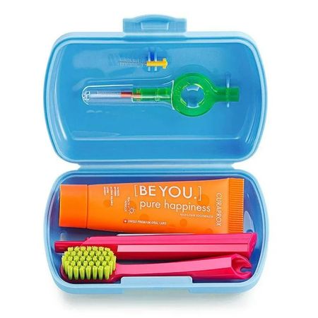 Дорожный набор BE YOU в комплектации: Зубная паста Be you orange со вкусом персика и абрикоса 10 мл Зубная щётка CS5460 Межзубные ёршики CPS prime 07, CPS prime 09 Держатель UHS 409 Синий бокс