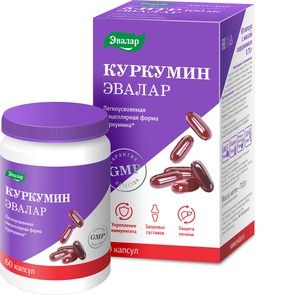 Куркумин Эвалар. Натуральная защита и укрепление иммунитета. Легко усваиваемая мицеллярная форма Куркумина. Выгоднее зарубежного аналогаАктивное вещество: Экстракт куркумы.Действие: Укрепление иммунитета, защита организма от вирусов, бактерий, грибков.Не секрет, что вирусы и другие возбудители атакуют нас постоянно. А это значит, что наш главный защитник – иммунитет – всегда должен быть на страже. Но нельзя забывать, что часто он сам нуждается в усиленной поддержке, особенно в периоды сезонных вспышек простудных инфекций. Как укрепить иммунитет, в период, когда вирусы готовы атаковать на каждом шагу? Ответ очень прост! Обратите внимание на куркуму.Как куркума воздействует на организм? Экстракт куркумы содержит активное вещество – куркумин – уникальный природный антибиотик. Он повышает иммунитет, активно борется с бактериями и вирусами, укрепляя клеточную мембрану, тем самым повышая ее защитную функцию. Куркумин помогает больным с хроническими заболеваниями восстановить силы после болезни, а также уберечься от простуды и гриппа в период вспышек заболеваний. Обладает антибактериальным, антисептическим и противовоспалительным действием, антимикробной активностью, но при этом не наносит вреда желудочно-кишечному тракту. Куркумин активизирует кишечную флору, улучшает пищеварение и не оказывает разрушительного действия на печень.Куркумин не только для иммунитета Помимо укрепления иммунной системы, куркумин обладает широким спектром полезных свойств. Он является сильным природным антиоксидантом. Куркумин повышает выделение желчи и пищеварительных соков. Препятствует образованию холестериновых камней в печени и желчном пузыре, стимулирует сокращение желчного пузыря и обладает гепатопротекторным действием. Он способен тормозить развитие опухолей, особенно толстого кишечника и прямой кишки. Куркумин также активно применяется для снижения суставных болей.Как усвоить куркумин? К сожалению, есть одна сложность: куркумин усваивается в виде специи лишь на 5-10 %. Но ученые научились получать легко усваиваемый куркумин, переводя его в мицеллярную форму, которая усваивается полностью.«Куркумин» Эвалар способствует: укреплению иммунитета, защите организма от вирусов, бактерий, грибков, защите и очищению печени, уменьшению воспалительных процессов и снижению боли в суставах, мягкому желчегонному действию, снижению риска образования желчных камней.При хранении допускается окрашивание стенок банки в желто-оранжевый цвет за счет входящего в состав натурального куркумина.