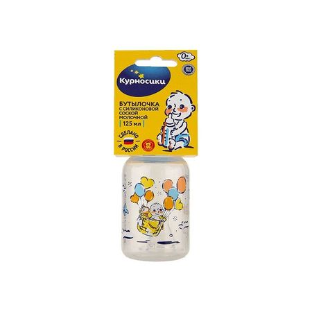 Бутылочка полипропиленовая с силиконовой соской молочной, 125 мл. Бутылочка произведена из полипропилена — термостойкого небьющегося пластика, не вступающего в химическую реакцию с молоком и не выделяющего вредных веществ при стерилизации. Возраст применения — с рождения.Цвет: голубой, желтый.