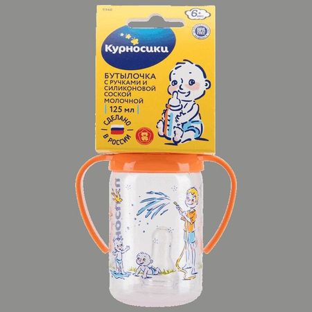 Бутылочка полипропиленовая с ручками, с силиконовой соской молочной, 125 мл. Бутылочка произведена из полипропилена — термостойкого небьющегося пластика, не вступающего в химическую реакцию с молоком и не выделяющего вредных веществ при стерилизации. Возраст применения — с рождения. Цвета: желтый, оранжевый, голубой.