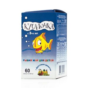 Рыбий жир "Кусалочка" для детей представлен в капсулах, которые очень нравятся детям. Они не имеют вкус и запах рыбьего жира. Рыбий жир обогащает питание ребенка полиненасыщенными жирными кислотами омега-3 (ПНЖК омега-3) и витаминами А, D, Е.Рыбий жир способствует: укреплению иммунитета; снижению проявлений аллергических реакций; нормализации деятельности нервной системы, головного мозга, зрительного аппарата; гармоничному росту и развитию ребенка.Рыбий жир укрепляет иммунитет.ПНЖК омега-3 являются предшественниками образующихся из них активных и важных биорегуляторов — эйкозаноидов линии Е 3, которые напрямую участвуют во множестве процессов, имеющих обобщённое название «иммунитет».Витамин D тоже проявляет иммуномодулирующие свойства. Повышение уровня витамина D приводит к синтезу белка, ответственного за разрушение микобактерий туберкулеза и других инфекционных агентов. Когда уровень витамина D в организме падает ниже определённого показателя, данный иммунный ответ не осуществляется.Витамин A повышает барьерную функцию слизистых оболочек, увеличивает фагоцитарную активность лейкоцитов (способность иммунных клеток поглощать, обезвреживать и выводить чужеродные клетки из организма).ПНЖК помогают бороться с аллергией.В развитии аллергических процессов важную роль играет чувствительность клеток эпителия слизистой оболочки и кожи к биологически активным веществам, таким как гистамин. Стоит повыситься чувствительности клеток к этим веществам, и уже небольшое раздражающее действие химического вещества может вызвать сильную аллергическую реакцию: зуд, крапивницу, отек кожи и тканей. Аллергические проявления развиваются за счет токсичности вещества, даже слабой, и повышенной чувствительности клеток организма к гистамину.Механизм действия омега-3 ПНЖК, согласно публикациям научных исследований, связан с их включением в клеточные мембраны. При этом степень внедрения омега-3 в клеточные мембраны соответствует их содержанию в пище. Т.е. ПНЖК омега 3 нормализуют жировой состав тканей организма, повышая стабильность клеток эпителия слизистых оболочек и кожи, снижается чувствительность клеток организма к токсическим веществам.ПНЖК омега-3 помогают бороться с симптомами бронхиальной астмы.Особого внимания заслуживает способность ПНЖК омега-3 блокировать синтез фактора активации тромбоцитов (ФАТ). ФАТ — один из важнейших медиаторов бронхо-спазма (вещество, запускающее цепь реакций, ведущих в данном случае к сужению бронхов). Со способностью w-3 блокировать синтез ФАТ связывают пользу, которую приносит приём омега-3 содержащих препаратов при бронхиальной астме, а именно облегчение всех симптомов у астматиков: снижение частоты и интенсивности приступов, облегчение дыхания.ПНЖК необходимы для мозга и зрения.Для растущего организма, когда формируется мозг и развивается зрительный аппарат, присутствие в организме определенных полиненасыщенных кислот в достаточном количестве жизненно необходимо. Установлено, что Докозагексаеновая кислота С 22:6 w3 (ДГК), содержащаяся в рыбьем жире, является ключевым строительным блоком клеточных мембран мозга, и сетчатки глаза.Более трети всех ПНЖК, содержащихся в БАД "Кусалочка" рыбий жир для детей, составляет докозагексаеновая кислота С 22:6 w3 (ДГК). Жирные кислоты омега-3 способствую