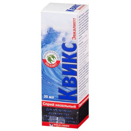 КВИКС ЭВКАЛИПТ — медицинское изделие КВИКС® Эвкалипт предназначен для детей, начиная с шести лет и взрослых. КВИКС® Эвкалипт применяется для облегчения симптоматики при заложенности носа и околоносовых пазух и обладает дополнительным освежающим эффектом. Действие изделия не реализуется путем фармакологического, иммунологического, генетического или метаболического воздействия на организм человека, а только благодаря физическим свойствам изделия. Изделие имеет кратковременный контакт с полостью носа. КВИКС® Эвкалипт — это природный гипертонический спрей, содержащий очищенную воду из Атлантического океана с добавлением небольшого количества очищенного эвкалиптового масла. Концентрация соли в медицинском изделии КВИКС® Эвкалипт выше, чем в слизистой оболочке носа (гипертонический солевой раствор), благодаря чему возникает осмотическое давление, благоприятно воздействующее на снятие отёка. Свойства медицинского изделия КВИКС® Эвкалипт. -Снимает отек и заложенность носа и носовых пазух, способствуя физическому удалению избытка жидкости из слизистой носа, таким образом уменьшая отек. -Размягчает скопившуюся слизь и облегчает процесс сморкания. -Дает ощущение чистого и «свободного» носа и носовых пазух, облегчая дыхание, благодаря ощущаемому физически освежающему эффекту эвкалиптового масла.
