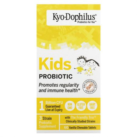 Детский пробиотик Kyo-Dophilus безопасен, легок в употреблении и обладает отличным вкусом. Детский пробиотик содержит комплекс The Friendly Trio, в состав которого входят три биологически совместимых штамма, свойственных человеческому организму. Продукт прошел клинические исследования, которые подтвердили эффективность этих штаммов для поддержания нормального функционирования ЖКТ. Ежедневный прием детского пробиотика способствует восполнению состава полезных бактерий в микрофлоре кишечника, защищая детей от воздействия вредных бактерий. Здоровая пищеварительная система также служит прочным фундаментов для здорового иммунитета. Здоровые дети — залог хорошего самочувствия всей семьи!