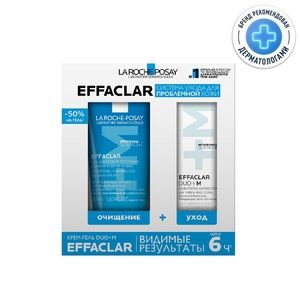 В набор входят два средства:1. Очищающий пенящийся гель Эфаклар 2000 млЭффективно удаляет загрязнения и кожное сало благодаря комплексу компонентов, мягко воздействующих на жирную чувствительную кожу. Оставляет кожу чистой и свежей. Благодаря специальной технологии поддерживает рН кожи. Используйте его регулярно, чтобы повысить эффективность ухода за проблемной кожей.2. Корректирующий крем-гель для проблемной кожи Duo+ M 15 млСокращает выраженные несовершенства, черные точки и постакне. Препятствует повторному образованию несовершенств и предупреждает появление остаточных следов от несовершенств в виде красных и темных пятен. Устраняет жирный блеск и увлажняет кожу. Можно использовать как базу под макияж.Активные компоненты филобиома актив — способствует сокращению количества несовершенств и избытка кожного сала, успокаивает кожу, воздействует на 4 параметра несовершенств (диаметр, рельеф, качество кожи и покраснения, вызванные несовершенствами) ниацинамид (витамин B3) — успокаивает и защищает кожу прокерад — способствует сокращению следов постакне в виде красных и темных пятен салициловая кислота — глубоко очищает поры липо-гидрокси кислота — мягко выравнивает микрорельеф кожи цинк – матирует кожу коко-бетаин – поверхностно-активное вещество, вырабатываемое из жирных кислот кокосового масла, мягко очищает кожу термальная вода La Roche-Posay – увлажняет, успокаивает кожу, защищает клетки кожи от повреждения под воздействием внешних факторов благодаря выраженному антиоксидантному эффекту