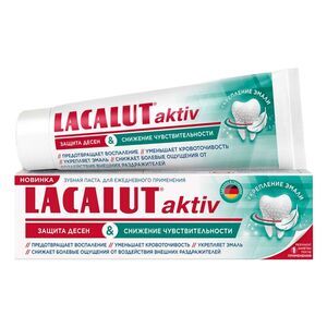 LACALUT® aktiv защита десен и снижение чувствительностиКомплексное действие зубной пасты Lacalut aktiv защита десен и снижение чувствительности направлено на укрепление десен и уменьшение гиперестезии. Антисептик снижает количество бактерий в полости рта и предотвращает воспаление, лактат алюминия уплотняет рыхлые десны и уменьшает их кровоточивость. Комплекс неорганических солей снижает повышенную чувствительность зубов на различные раздражители. Фторид укрепляет эмаль и защищает ее от кариеса.Активные компоенты: Лактат алюминия. Укрепляет дёсны, уплотняет рыхлые дёсны и уменьшает их кровоточивость. Фторид натрия. Укрепляет эмаль и защищает её от кариеса. Хлоргексидин. Снижает воспаление. Ацетат стронция. Уменьшает болевые ощущения. Хлорид калия. Снижает чувствительность дентина. Абразив. Удаляет налёт.