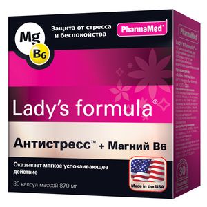 Lady’s formula® — это линейка 13 биокомплексов для укрепления женского здоровья с учетом физиологических и возрастных особенностей.Биологически активная добавка к пище Lady’s Formula Антистресс™+ Магний В6 оказывает мягкое успокаивающее действие. Cнижает эмоциональное напряжение и повышает стрессоустойчивость Поддерживает дневную активность и усиливает концентрацию внимания Восстанавливает процесс засыпания и глубокий сонБиологически активные компонентыСодержание в 1 капсуле (не превышает верхнего допустимого уровня потребления**)Витамины:Витамин Е — 13,4 мг — 130*% от рекомендуемого уровня суточного потребленияПантотеновая кислота (витамин B5) — 15 мг — 250*% от рекомендуемого уровня суточного потребленияНикотинамид (витамин B3) — 20 мг — 111*% от рекомендуемого уровня суточного потребленияВитамин В6 — 5 мг — 300*% от рекомендуемого уровня суточного потребленияВитамин В2 — 2 мг — 125*% от рекомендуемого уровня суточного потребленияВитамин В1 — 1,5 мг — 107*% от рекомендуемого уровня суточного потребленияМинеральные вещества:Кальций — 90 мг -9*% от рекомендуемого уровня суточного потребленияМагний — 40 мг — 10*% от рекомендуемого уровня суточного потребленияЦинк — 10 мг — 67*% от рекомендуемого уровня суточного потребления* Технический регламент Таможенного союза Пищевая продукция в части ее маркировки ТР ТС 022/2011, приложение 2.** Единые санитарно-эпидемиологические и гигиенические требования к товарам, подлежащим санитарно-эпидемиологическому надзору (контролю) , приложение 5.Экстракты растений:Экстракт листьев зеленого чаяЭкстракт зверобоя продырявленногоЭкстракт цветков пассифлорыЭкстракт корня валерианыЭкстракт хмеля