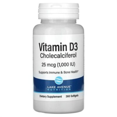 Витамин D3 Lake Avenue Nutrition25 мкг (1000 МЕ)Поддерживает здоровье иммунной системы и костей*360 капсул обеспечат поддержку на весь годНе содержит ГМО, глютена и свиного желатинаПроизводится на предприятии, имеющем регистрацию надлежащей производственной практики (GMP)