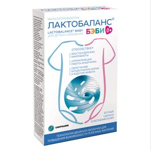 Инновационная технология 4-го поколения двойной оболочки пробиотических бактерий*, с pH-зависимым высвобождением бактерий, в кишечнике. Такая технология повышает их выживаемость в 100 раз, по сравнению с бактериями без такого покрытия (2, 3, 27, 28).Благодаря данной технологии больше полезных бактерий попадают в кишечник, где они поддерживают нормальную микробиоту. ЛАКТОБАЛАНС® БЭБИ содержит: пробиотики: сбалансированная комбинация 6 видов микроорганизмов (бифидо- и лактобактерий), пребиотики: натуральная «подкормка» для входящих в состав полезных микроорганизмов и для собственной микробиоты ребенка.ЛАКТОБАЛАНС® БЭБИ: содержит жизнеспособные пробиотические бактерии и пребиотики, которые усиливают действия друг друга, способствует восстановлению микробиоты, нормализации работы кишечника, облегчению младенческих колик и вздутия живота, в ситуациях, связанных: с дисбактериозом, применением лекарственных средств, нарушающих баланс микробиоты кишечника, нарушением стула, вздутием живота, тошнотой и рвотой, дискомфортом в животе, аллергическими реакциями, нарушением пищеварения, не требует хранения в холодильнике, 1 саше в день, допускается одновременное применение с антибиотиками, разрешен для детей с рождения, не содержит ГМО, искусственных консервантов и красителей, лактозы, глютена и желатина животного происхождения, производных молока и казеина, поэтому может применяться у детей с непереносимостью лактозы и с аллергией на молочные продукты, сохраняет жизнеспособность бактерий благодаря их двойной защите.Микробиота ребенка формируется с первых дней жизни, когда кишечник заселяют полезные бактерии (30). Поэтому самочувствие ребенка во многом зависит от микробного баланса. Любое нарушение этого баланса может вызывать дискомфорт и нарушение работы кишечника. Пробиотики помогают поддерживать микробиоту кишечника, способствуют ее правильному формированию, становлению пищеварительной и иммунной функций (29).Состав ЛАКТОБАЛАНС® БЭБИ подобран таким образом, что его компоненты усиливают и дополняют друг друга, помогают восстанавливать микробный баланс кишечника, поддерживать иммунитет, противостоять вредоносному воздействию болезнетворных микробов, аллергенов, токсинов, поступающих в организм из внешней среды.Пребиотики рекомендованы: для поддержания нормальной микробиоты кишечника и пищеварения (в том числе при вводе прикорма, переходе на искусственное вскармливание и при прорезывании зубов) (14, 29), в качестве вспомогательного средства при функциональных расстройствах кишечника и стула, при нарушении пищеварения, метеоризме (вздутии живота), тошноте, отрыжке, дискомфорте в животе и пр. (31, 32), при приеме антибиотиков (4, 11), в сезон простуд для укрепления иммунитета (1), для повышения общей резистентности (устойчивости) детского организма при аллергических реакциях (21), в качестве поддержания нормальной функции кишечника при смене климата, рациона питания (детский сад, путешествие), для улучшения усвоения полезных веществ и синтеза важных витаминов и аминокислот (11, 14, 29).Бифидо- и лактобактерии чувствительны к факторам внешней и вну- тренней среды и могут погибать при хранении и приеме продукта, инно- вационная запатентованная технология двойной оболочки (2, 3) позволяет сохранять полезные бактерии (27, 28) и доставлять