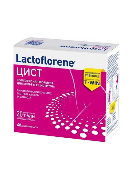 Lactoflorene® ЦИСТ — комплексная формула для борьбы с циститом, в состав входят пробиотики, растительные экстракты и D-манноза, которые способствуют уменьшению болей и резей при мочеиспускании, снижению риска появления инфекций мочевыводящих путей (ИМП) и дискомфорта от их проявлений. Lactoflorene® ЦИСТ воздействует на причину ИМП — дисбактериоз, способствует выведению возбудителей инфекции и заботится о здоровье всей мочевыделительной системы в целом. Живые молочнокислые бактерии с их пробиотическим действием помогают восстановить баланс кишечной флоры. Экстракт клюквы, богатый проантоцианидинами, способствует правильному функционированию мочевыделительной системы. D-манноза — это простой сахар, экстрагируемый из березы, который медленно усваивается, и за счет этого достигает почек и мочевого пузыря, где связывает бактерии-возбудители инфекции E. сoli и способствует их выведению с мочой. Таким образом, Lactoflorene® ЦИСТ можно использовать как при заболеваниях мочевыводящих путей, так и для снижения риска их развития. Lactoflorene® ЦИСТ выпускается в инновационной упаковке T-WIN. Двухкамерные пакетики T-WIN разделены на две части (камеры) A и B. В камере А находятся ферменты и растительные экстракты, В камере B — молочнокислые бактерии. Пробиотики чувствительны к влаге и другим компонентам. Упаковка T-WIN позволяет содержащимся внутри компонентам не взаимодействовать друг с другом до использования продукта и обеспечивает оптимальное сохранение свойств.