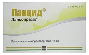 Показания к применению— язвенная болезнь желудка и двенадцатиперстной кишки (в фазе обострения); — эрозивно-язвенный эзофагит; — рефлюкс-эзофагит; — синдром Золлингера-Эллисона; — стрессовые язвы ЖКТ; — неязвенная диспепсия.Применение при беременности и кормлении грудьюГруппа В. Адекватных и контролируемых исследований применения препарата при беременности не проводилось.;Противопоказан в I триместре беременности.;С осторожностью следует назначать препарат во II-III триместрах беременности.;Применение препарата во время лактации противопоказано.Противопоказания— злокачественные новообразования ЖКТ; — I триместр беременности; — период лактации; — повышенная чувствительность к компонентам препарата.;С осторожностью следует назначать препарат при печеночной недостаточности, во II-III триместрах беременности, пациентам пожилого возраста и пациентам в возрасте до 18 лет.Побочное действиеСо стороны пищеварительной системы: менее часто — повышение или понижение аппетита, тошнота, боль в животе; редко — диарея или запоры; в отдельных случаях — неспецифический язвенный колит, кандидоз ЖКТ, повышение активности печеночных трансаминаз (АЛТ, АСТ), ГГТ, ЩФ и ЛДГ, гипербилирубинемия.;Со стороны нервной системы: головная боль; редко — недомогание, головокружение, сонливость, депрессия, тревожность.;Со стороны дыхательной системы: редко — кашель, фарингит, ринит, инфекция верхних дыхательных путей, гриппоподобный синдром.;Со стороны органов кроветворения: редко — тромбоцитопения (с геморрагическими проявлениями); в отдельных случаях — анемия.;Аллергические реакции: кожная сыпь; в отдельных случаях — фотосенсибилизация, многоформная экссудативная эритема.;Прочие: редко — миалгия, алопеция.СоставЛансопразол 15 мг;Вспомогательные вещества: маннитол — 129.7 мг, лактозы моногидрат — 13 мг, сахароза — 16.6 мг, повидон — 3.5 мг, гипромеллозы фталат — 18.2 мг, цетиловый спирт — 2 мг.;Состав корпуса капсулы: желатин — 24.7626 мг, натрия лаурилсульфат — 0.024 мг, пропилпарагидроксибензоат — 0.24 мг, метилпарагидроксибензоат — 0.06 мг, титана диоксид — 0.5557 мг, краситель бриллиантовый голубой — 0.0034 мг, краситель хинолиновый желтый — 0.0042 мг, вода — 4.35 мг.;Состав крышечки капсулы: желатин — 16.5084 мг, натрия лаурилсульфат — 0.016 мг, пропилпарагидроксибензоат — 0.04 мг, метилпарагидроксибензоат — 0.16 мг, титана диоксид — 0.3705 мг, краситель бриллиантовый голубой — 0.0022 мг, краситель хинолиновый желтый — 0.0028 мг, вода — 2.9 мг.