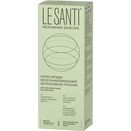 КРЕМ ПИТАЕТ И СМЯГЧАЕТ КОЖУ, БЫСТРО ВПИТЫВАЕТСЯ, НЕ ОСТАВЛЯЯ ОЩУЩЕНИЯ ЖИРНОСТИ. Активная система ухода LE SANTI MICROBIOME SKINCARE содержит эффективный BIOTIC COMPLEX, направленный на нормализацию микробиома и восстановление естественных защитных механизмов кожи. Кожа возвращается к своему здоровому состоянию, перестает быть источником дискомфорта, тревог и раздражений: ФРАКЦИИ ПРОБИОТИКА Lactobacillus plantarum способствуют пробуждению естественных механизмов защиты кожи, обеспечивают увлажнение, снижение чувствительности и усиливают барьерные функции. ПРЕБИОТИЧЕСКИЙ КОМПЛЕКС создаёт условия для развития собственной полезной микрофлоры,что важно для поддержания здоровья кожи и её иммунитета. 01/ Способствует нормализации водно-липидного баланса кожи, образует защитный слой, препятствующий потере влаги. 02/ Питает и сохраняет кожу увлажненной длительное время. 03/ Стимулирует регенерацию клеток кожи и быстро снимает раздражение, повышает эластичность и упругость кожи.
