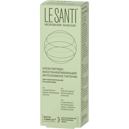 КРЕМ LE SANTI ЛИПИДОВОССТАНАВЛИВАЮЩИЙ ИНТЕНСИВНОЕ ПИТАНИЕ 75 мл. Для чувствительной, сухой и очень сухой кожи, в том числе склонной к атопии. КРЕМ ПИТАЕТ И СМЯГЧАЕТ КОЖУ, БЫСТРО ВПИТЫВАЕТСЯ, НЕ ОСТАВЛЯЯ ОЩУЩЕНИЯ ЖИРНОСТИ. Активная система ухода LE SANTI MICROBIOME SKINCARE содержит эффективный BIOTIC COMPLEX, направленный на нормализацию микробиома и восстановление естественных защитных механизмов кожи. Кожа возвращается к своему здоровому состоянию, перестает быть источником дискомфорта, тревог и раздражений: ФРАКЦИИ ПРОБИОТИКА Lactobacillus plantarum способствуют пробуждению естественных механизмов защиты кожи, обеспечивают увлажнение, снижение чувствительности и усиливают барьерные функции. ПРЕБИОТИЧЕСКИЙ КОМПЛЕКС создаёт условия для развития собственной полезной микрофлоры,что важно для поддержания здоровья кожи и её иммунитета. АКТИВНЫЕ КОМПОНЕНТЫ [BIOTIC COMPLEX: про- и пребиотики] работает на уровне микробиома. ПАНТЕНОЛ Обладает регенерирующим и смягчающим действием, питает кожу, быстро снимает раздражение, увеличивает прочность коллагеновых волокон. МАСЛО ШИ Способствует нормализации водно-липидного баланса кожного покрова. Питает и увлажняет, повышает эластичность и упругость кожи. СКВАЛАН Восстанавливает структуру, защищает кожу от неблагоприятных внешних воздействий, сохраняет её увлажненной длительное время. ВИТАМИН Е Мощный антиоксидант, оберегает липидную мантию кожи и обладает способностью снижать вредное воздействие УФ-лучей на кожу. 01/ Способствует нормализации водно-липидного баланса кожи, образует защитный слой, препятствующий потере влаги. 02/ Питает и сохраняет кожу увлажненной длительное время. 03/ Стимулирует регенерацию клеток кожи и быстро снимает раздражение, повышает эластичность и упругость кожи.