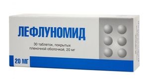 Показания к применениюБазисная терапия ревматоидного артрита с целью уменьшения симптомов заболевания и задержки развития структурных повреждений суставов.;Активная форма псориатического артрита.Применение при беременности и кормлении грудьюПротивопоказан при беременности, в период лактации.;Противопоказан женщинам детородного возраста, которые не используют адекватные средства контрацепции.;Мужчины, получающие лечение лефлуномидом, должны быть предупреждены о возможном фетотоксическом действии и о необходимости использовать адекватные средства контрацепции.ПротивопоказанияНарушения функции печени, тяжелые иммунодефицитные состояния (в т.ч. СПИД); выраженные нарушения костномозгового кроветворения или анемия, лейкопения, тромбоцитопения в результате других причин (кроме ревматоидного артрита), инфекции тяжелого течения, умеренная или тяжелая почечная недостаточность (из-за незначительного опыта клинических наблюдений), тяжелая гипопротеинемия (в т.ч. при нефротическом синдроме), беременность, лактация, детский и подростковый возраст до 18 лет, повышенная чувствительность к лефлуномиду.Побочное действиеСо стороны сердечно-сосудистой системы: часто — повышение АД.;Со стороны пищеварительной системы: часто — диарея, тошнота, рвота, анорексия, поражения слизистой оболочки полости рта (афтозный стоматит, изъязвление губ), боли в брюшной полости, повышение уровня печеночных ферментов (особенно АЛТ, реже — ГГТ, ЩФ, билирубина); редко — гепатит, желтуха, холестаз; в отдельных случаях — печеночная недостаточность, острый некроз печени.;Со стороны костно-мышечной системы: часто — тендовагинит; возможны — разрыв связок.;Дерматологические реакции: часто — выпадение волос, экзема, сухость кожи; возможны — синдром Стивенса-Джонсона, синдром Лайелла, многоформная эритема.;Со стороны системы кроветворения: часто — лейкопения (лейкоциты более 2000/мкл); возможны — анемия, тромбоцитопения (тромбоциты менее 100 000/мкл); редко — эозинофилия, лейкопения (лейкоциты менее 2000/мкл), панцитопения; в отдельных случаях — агранулоцитоз. Риск развития гематологических нарушений возрастает при недавнем, сопутствующем и последующем применении миелотоксических препаратов.;Аллергические реакции: часто — сыпь (в т.ч. макуло-папулезная), зуд; нетипичные — крапивница; в отдельных случаях — анафилактические реакции.;Со стороны процессов обмена: легкая гиперлипидемия, гипофосфатемия, снижение уровня мочевой кислоты. Лабораторные данные (не подтвержденные клинически) свидетельствуют о небольшом повышении ЛДГ, КФК.;Прочие: в отдельных случаях — развитие тяжелых инфекций и сепсиса; возможно развитие ринита, бронхита и пневмонии. При применении иммунодепрессивных препаратов возрастает риск развития злокачественных и некоторых лимфопролиферативных процессов. Нельзя исключить возможность обратимого уменьшения концентрации спермы, общего количества сперматозоидов и их подвижности.