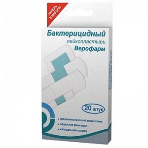 Бактерицидный лейкопластырь Верофарм представляет собой ленту Лейкопластыря Верофарм или Лейкопластыря «Унипласт фиксирующий» с подушечкой зеленого цвета из нетканого материала, пропитанного раствором антисептиков, покрытую с липкой стороны защитным покрытием. Бактерицидный лейкопластырь Верофарм производится в следующих исполнениях:- полоска липкая прямоугольной формы с перфорацией или без нее с антисептической подушечкой следующих типоразмеров в см: О,95х3,8, 6,Ох2,О, 4,Ох10,О, 6,Ох10,О, 8,Ох10,О, 6,Ох100,О, 6,0xSOO,O,- полоска липкая прямоугольной формы с закругленными углами с перфорацией или без нее с антисептической подушечкой следующих типоразмеров в см: 1,9х7,2, 2,3х7,2, 2,5х7,2, 3,8х7,2,- полоска липкая квадратной формы с закругленными углами или без них с перфорацией или без нее с антисептической подушечкой размером в см: 3,8х3,8,- полоска липкая круглой формы с перфорацией или без нее с антисептической подушечкой диаметром 2,3 см,- полоска липкая фигурная с перфорацией или без нее с антисептической подушечкой следующих типоразмеров в см: 3,8х7,О, 3,8х7,5, 5,Ох4,4, 5,Ох8,О, 5,Ох10,О.