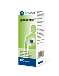 Показания к применению- в качестве отхаркивающего средства при лечении острых и хронических воспалительных заболеваний дыхательных путей, сопровождающихся кашлем и образованием мокроты (трахеит, трахеобронхит, бронхит).Применение при беременности и кормлении грудьюНе рекомендуется принимать препарат при беременности и в период лактации (грудного вскармливания).Противопоказания- детский возраст до 3 месяцев;- повышенная чувствительность к компонентам препарата.Вследствие наличия этанола не рекомендуется назначать препарат при алкоголизме, эпилепсии, заболеваниях печени, заболеваниях и травмах головного мозга.Побочное действиеВозможно: аллергические реакции.Состав100 г:жидкий экстракт травы тимьяна (Thymus vulgaris) (1:2-2.5)* 15 гжидкий экстракт листьев плюща (Hedera helix) (1:1)** 1.5 г* Экстрагент: по DAB 10.** Экстрагент: этанол 70% (в объемном отношении).Содержание этанола: 19% (в объемном отношении).Вспомогательные вещества: вода очищенная, мальтитный сироп, калия сорбат, лимонной кислоты моногидрат.Взаимодействие с другими препаратамиСироп Бронхипрет не следует применять одновременно с противокашлевыми препаратами, а также с лекарственными средствами, уменьшающими образование мокроты, т.к. это затрудняет откашливание разжиженной мокроты.Возможна комбинация с антибактериальными лекарственными средствами.