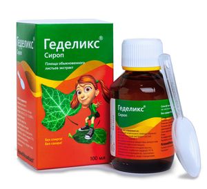 Показания к применениюВ качестве отхаркивающего средства при инфекционно-воспалительных заболеваниях верхних дыхательных путей и бронхов с трудно отделяемой мокротой.Применение при беременности и кормлении грудьюНе рекомендуется применять при беременности и в период лактации.ПротивопоказанияПовышенная чувствительность к компонентам препарата. Геделикс сироп нельзя принимать при наследственной непереносимости фруктозы, недостаточности аргининсукцинат-синтетазы.Побочное действиеВозможны аллергические реакции, тошнота, в редких случаях — боли в эпигастральной области.СоставДействующее вещество: Экстракт из листьев плющаВспомогательные вещества: Макрогола глицерилгидроксистеарат — 0,500 г,Анисовое масло — 0,015 г, Гидроксиэтилцеллюлоза — 0,150 г,Сорбитола раствор 70%, (некристаллизующийся) — 50,000 г, Пропиленгликоль — 13,877 г,Глицерол — 10,000 г,Вода очищенная — 39,968Концентрация действующего вещества (мг): 800 мгВзаимодействие с другими препаратамиПрепарат не следует применять одновременно с противокашлевыми ЛС, т.к. это затрудняет отхождение разжиженной мокроты.