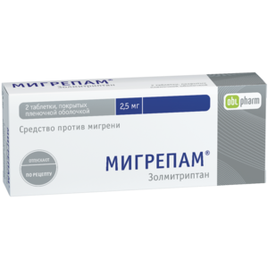 Главная » Аптека Лекарственное средство Мигрепам 2,5 мг таблетки 2 шт Просмотров 11 Таблетки Мигрепам — противомигренозное средство. Оболенское ФП