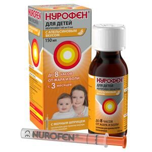 Показания к применениюСуспензию Нурофен® для детей применяют у детей с 3 месяцев жизни до 12 лет для симптоматического лечения в качестве жаропонижающего средства при острых респираторных заболеваниях (в том числе, гриппе), детских инфекциях, других инфекционно-воспалительных заболеваниях и постпрививочных реакциях, сопровождающихся повышением температуры тела.Препарат применяют как симптоматическое обезболивающее средство при болевом синдроме слабой или умеренной интенсивности, в том числе: зубной боли, головной боли, мигрени, невралгиях, боли в ушах, боли в горле, боли при растяжении связок, мышечной боли, ревматической боли, боли в суставах.Препарат предназначен для симптоматической терапии, уменьшения боли и воспаления на момент использования, на прогрессирование заболевания не влияет.Применение при беременности и кормлении грудьюНурофен для детей не назначают во время беременности, кормления грудью и детям с массой тела менее 7 кг.Противопоказания Гиперчувствительность к ибупрофену или любому из компонентов, входящих в состав препарата. Полное или неполное сочетание бронхиальной астмы, рецидивирующего полипоза носа и околоносовых пазух и непереносимости ацетилсалициловой кислоты или других НПВП. Кровотечение или перфорация язвы желудочно-кишечного тракта в анамнезе, спровоцированные применением НПВП. Эрозивно-язвенные заболевания органов желудочно-кишечного тракта (в том числе язвенная болезнь желудка и двенадцатиперстной кишки, болезнь Крона, язвенный колит) или язвенное кровотечение в активной фазе или в анамнезе (два или более подтвержденных эпизода язвенной болезни или язвенного кровотечения). Тяжелая печеночная недостаточность или заболевание печени в активной фазе. Почечная недостаточность тяжелой степени тяжести (клиренс креатинина < 30 мл/мин), подтвержденная гиперкалиемия. Декомпенсированная сердечная недостаточность, период после проведения аортокоронарного шунтирования. Цереброваскулярное или иное кровотечение. Гемофилия и другие нарушения свертываемости крови (в том числе гипокоагуляция), геморрагические диатезы. Беременность (III триместр). Непереносимость фруктозы. Масса тела ребенка до 5 кг.СоставВ 5 мл суспензии Нурофен® для детей содержит:действующее вещество: ибупрофен 100 мг,вспомогательные вещества: полисорбат 80 0,5 мг, глицерол 0,5 мл, сироп мальтитола 1,625 мл, натрия сахаринат 10 мг, кислота лимонная 20 мг, натрия цитрат 25,45 мг, камедь ксантановая 37,5 мг, натрия хлорид 5,5 мг, домифена бромид 0,5 мг, апельсиновый ароматизатор 2М16014 или клубничный ароматизатор 500244Е 12,5 мг, вода очищенная до 5 мл.