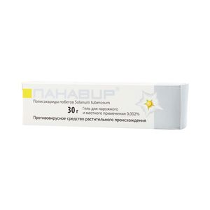 Показания к применениюПанавир гель применяют для лечения пациентов, страдающих инфекционно-воспалительными заболеваниями слизистых оболочек и кожи, которые вызваны вирусом простого герпеса первого и второго типа, включая оральный и генитальный герпес.Применение при беременности и кормлении грудьюДопускается применение препарата Панавир гель в период беременности только в случае если ожидаемая польза для матери выше, чем возможные риски для плода.Назначение препарата Панавир гель в период лактации допускается только после решения вопроса об отмене грудного вскармливания.ПротивопоказанияПанавир гель не назначают пациентам с известной гиперчувствительностью к компонентам, входящим в состав препарата.Панавир не применяют в педиатрической практике.Побочное действиеПанавир гель обычно неплохо переносится пациентами. Сообщалось об отдельных случаях развития кожных реакций гиперчувствительности в период терапии препаратом Панавир.В случае развития аллергических реакций следует прекратить применение препарата и обратиться к врачу.СоставЭкстракта побегов Solanum tuberosum – 0,002 г;Взаимодействие с другими препаратамиНе следует одновременно наносить гель Панавир с другими препаратами для местного применения на один участок кожного покрова.