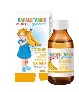 ПАРАЦЕТАМОЛ ФортеКидс, 250 мг/5 мл, суспензия для приема внутрь со вкусом и ароматом банана. Гомогенная суспензия от светло-серого или светло-серого с желтоватым или коричневатым или розоватым оттенком цвета до серого или серого с желтоватым или коричневатым или розоватым оттенком цвета с характерным вкусом и запахом банана.