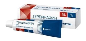 Показания к применению— профилактика и лечение грибка, грибковых инфекций кожи, в том числе микозов стоп («грибок» стопы), паховой эпидермофитии (tinea cruris), грибковых поражений гладкой кожи тела (tinea corporis), вызванных такими дерматофитами, как Trichophyton (в т.ч. Т. rubrum, T. mentagrophytes, T. verrucosum, T.violaceum), Microsporum canis и Epidermophyton floccosum — дрожжевые инфекции кожи, в основном те, которые вызываются родом Candida (например, Candida albicans), в частности опрелость — разноцветный лишай (Pityriasis versicolor), вызываемый Pityrosporum orbiculare (также известный под названием Malassezia furfur).Применение при беременности и кормлении грудьюВ экспериментальных исследованиях тератогенных свойств тербинафина выявлено не было. До настоящего времени не сообщалось о каких-либо пороках развития при применении Тербинафина. Однако, поскольку клинический опыт применения Тербинафина у беременных женщин очень ограничен, его следует применять только по строгим показаниям. Тербинафин выделяется с грудным молоком. Однако, в случае применения кормящей матерью Тербинафина крема через кожу всасывается небольшое количество активного вещества, поэтому неблагоприятное воздействие на младенца маловероятно.Противопоказания— повышенная чувствительность к тербинафину или к любому из неактивных ингредиентов, входящих в состав препарата. С осторожностью: печеночная и/или почечная недостаточность, алкоголизм, угнетение костномозгового кроветворения, опухоли, болезни обмена веществ, окклюзионные заболевания сосудов конечностей, детский возраст до 12 лет (отсутствие достаточного клинического опыта).Побочное действиеВ местах нанесения препарата может появиться покраснение, ощущение зуда или жжение. Аллергические реакции.Состав1 г тербинафина гидрохлорид 10 мг. Вспомогательные вещества: спирт бензиловый, полисорбат 60 (твин 60), сорбитана моностеарат, цетиловый спирт, изопропилмиристат, цетилпальмитат, натрия гидроксид, вода очищенная.Взаимодействие с другими препаратамиКакие-либо лекарственные взаимодействия для Тербинафина крема не известны.