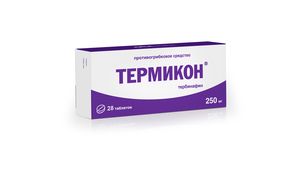 Показания к применениюМикозы волосистой части головы (трихофития, микроспория). Микозы кожи и ногтей, обусловленные Trychophyton (T. rubrum, mentagrophytes, verrucosum, violaceum), Microsporum (M. canis, M.gypseum) и Epidermophyton floccosum. Онихомикозы. Тяжелые, распространенные дерматомикозы гладкой кожи туловища и конечностей, требующие системного лечения. Кандидозы кожи и слизистых оболочек.Применение при беременности и кормлении грудьюОпыт применения препарата Термикон при беременности ограничен, поэтому его назначение при беременности противопоказано.Тербинафин выделяется с грудным молоком, поэтому при необходимости назначения препарата в период лактации следует решить вопрос о прекращении грудного вскармливания.В экспериментальных исследованиях тератогенное действие тербинафина не выявлено. До настоящего времени не сообщалось о каких-либо пороках развития при применении тербинафина.ПротивопоказанияПовышенная чувствительность к какому-нибудь компоненту препарата; детский возраст до 3 лет и с массой тела до 20 кг (для данной лекарственной формы), период кормления грудью.Побочное действиеДиспепсические нарушения (снижение аппетита, тошнота, диарея, чувство переполнения желудка, боль в животе); кожные аллергические реакции (крапивница, сыпь); мышечно-скелетные реакции (артралгия, миалгия), усугубление течения системной красной волчанки.Нарушения вкусовых ощущений, включая их утрату (восстановление происходит в течение нескольких недель после прекращения лечения).Крайне редко: гепатобилиарные нарушения (холестатическая желтуха), злокачественная экссудативная эритема (синдром Стивенса — Джонсона), токсический эпидермальный некролиз (синдром Лайелла), анафилактоидные реакции, агранулоцитоз или тромбоцитопения, нейтропения, лимфопения.СоставДействующее вещество: ТербинафинКонцентрация действующего вещества (мг): 250 мг