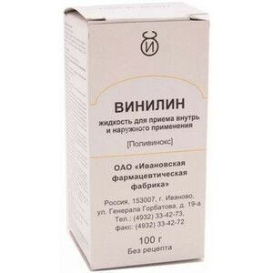 Главная » Аптека Лекарственное средство Винилин жидкость для приема внутрь и наружного применения 50 г Просмотров 11 Густая, вязкая жидкость светло-желтого цвета, с характерным запахом. На воздухе не густеет и не высыхает. Ивановская Фармацевтическая Фабрика