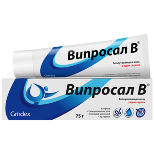 Показания к применению— невралгии,— артралгии,— миозит.Применение при беременности и кормлении грудьюПрепарат противопоказан к применению при беременности и в период лактации (грудного вскармливания).Противопоказания— повышенная чувствительность к компонентам препарата.— повреждения кожных покровов,— кожные заболевания (в т.ч. аллергического и бактериального генеза),— лихорадочные состояния,— туберкулез легких,— нарушения мозгового и коронарного кровообращения,— склонность к возникновению ангиоспазмов,— тяжелые нарушения функции почек,— тяжелые нарушения функции печени,— общее истощение,— детский возраст до 12 лет,— беременность,— период грудного вскармливания.Побочное действиеАллергические реакции: зуд, отек или крапивница.Во избежание побочных явлений рекомендуется предварительно нанести небольшое количество мази на кожу для определения чувствительности к препарату.При появлении побочных эффектов пациент должен проконсультироваться с врачом.Состав1 гяд гадюки обыкновенной сухой0.05 МЕДкамфора рацемическая30 мгскипидар живичный30 мгсалициловая кислота10 мгВспомогательные вещества: вазелин, цетостеариловый спирт, парафин твердый, натрия цетилстеарилсульфат, глицерол, натрия хлорид, вода очищенная — до 1 г.Взаимодействие с другими препаратамиНе описано.