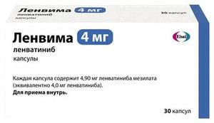Показания к применениюПрепарат Ленвима показан для терапии пациентов с прогрессирующим дифференцированным раком щитовидной железы, рефрактерным к радиоактивному йоду.Применение при беременности и кормлении грудьюБеременностьИнформации о применении ленватиниба у беременных женщин недостаточно. При введении крысам и кроликам ленватиниб оказывал эмбриотоксический и тератогенный эффект.Женщинам следует предохраняться от наступления беременности, используя эффективные методы контрацепции во время применения ленватиниба и на протяжении, по меньшей мере, одного месяца после завершения лечения.Период грудного вскармливанияНеизвестно, выделяется ли ленватиниб с грудным молоком человека. Ленватиниб и его метаболиты экскретируются с грудным молоком крыс. Из-за потенциальных неблагоприятных эффектов для младенца, грудное вскармливание следует прекратить во время приема матерью ленватиниба.ФертильностьВлияние ленватиниба на фертильность человека не изучено. Ведение препарата крысам, собакам и обезьянам сопровождалось токсическим воздействием на яички и яичники.Противопоказания— гиперчувствительность к действующему веществу или другим компонентам препарата;— беременность и период грудного вскармливания;— детский возраст до 18 лет (данные по эффективности и безопасности для данной категории пациентов отсутствуют);— хронические заболевания почек в терминальной стадии (данные по эффективности и безопасности для данной категории пациентов отсутствуют).С осторожностьюПациенты с артериальной гипертензией (см. раздел «Особые указания»).Пациенты с печеночной недостаточностью (см. раздел «Особые указания»).Пациенты с почечной недостаточностью (см. раздел «Особые указания»).Перенесенные хирургические операции или лучевая терапия (см. раздел «Особые указания»).Пациенты старше 75 лет (см. подраздел «Особые группы пациентов» раздела «Побочное действие»).Пациенты с врожденным синдромом удлиненного интервала QT, застойной сердечной недостаточностью или брадиаритмией, а также пациенты, одновременно получающие лекарственные препараты, удлиняющие интервал QT (необходим мониторинг электрокардиографических показателей).Состав1 капсула содержит: Активного вещества: ленватиниба мезилат 4.9 мг, что соответствует содержанию ленватиниба 4 мг.Вспомогательные вещества: кальция карбонат — 33 мг, маннитол — 16.1 мг, целлюлоза микрокристаллическая — 15 мг, гипролоза — 3 мг, гипролоза низкозамещенная — 25 мг, тальк — 3 мг; оболочка из гипромеллозы (гипромеллоза — 98.2%, титана диоксид — 1.2%, краситель железа оксид желтый (E172) — 0.1%, краситель железа оксид красный (E172) — 0.5%) — 37 мг; чернила (шеллак, краситель железа оксид черный (E172), калия гидроксид, пропиленгликоль).