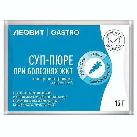 Суп-пюре овощной с травами и овсянкой – эффективный специализированный пищевой продукт диетического лечебного и профилактического питания при болезнях желудочно-кишечного тракта, способствующий снижению воспаления и заживлению слизистой желудка и кишечника. Обеспечивает щадящую диету пациентам при болезнях ЖКТ. Под влиянием щадящих диет, как правило, исчезают все клинические проявления заболевания. Функциональное щажение желудка достигается за счет дробного питания (употреблять пищу через 3-4 часа, небольшими порциями), консистенции супа-пюре (пюреобразная пища), ограничения в пищевом рационе легкоусвояемых углеводов (без добавления сахара). Вкус супа-пюре нейтральный, что обусловлено специальным требованием к питанию при болезнях ЖКТ. Овощной суп-пюре с овсянкой является слабым возбудителем секреции желудка и быстро покидает желудок. Чем более продолжительное время пища находится в желудке, тем больше раздражает она слизистую оболочку и повышает его секреторную функцию. Включением в рацион специализированного супа-пюре можно воздействовать на нарушенный обмен, стимулировать процессы заживления язвенного дефекта, влиять на регуляторную функцию нервной системы. При желании в суп-пюре можно добавить немного растительного масла. — Прополис и девясил создают неблагоприятную среду для Helicobacter pylori, золотистого стафилококка, кишечной палочки, дрожжеподобных грибов кандида, что обеспечивает благоприятные условия для заживления слизистой. — Родиола розовая позволяет снизить негативные последствия действия стресса на организм, в результате чего значительно уменьшается количество эрозий секреторной части желудка. — Каротиноиды моркови, тыквы, абрикоса и слизистые вещества овса, девясила, картофеля, куркумы, инулина, пектина, гуаровой камеди защищают слизистую оболочку и способствуют её заживлению. — Дубильные вещества барбариса, зверобоя, мелиссы оказывают противовоспалительное действие — Комплекс витаминов и минералов, необходимых в лечении и профилактике болезней ЖКТ. Витамин С усиливает окислительно-восстановительные и регенерационные процессы, обладает десенсибилизирующими свойствами и угнетает секрецию и моторику желудка у больных язвенной болезнью. Витамин В12 благоприятно влияет на нервную систему и способствует нормализации кислотности желудочного сока. Биотин помогает лучше усваивать белок. Рибофлавин, пиридоксин (витамин В6) и фолиевая кислота стимулируют процессы регенерации. Витамин Е и бета-каротин способствует эпителизации язв. Тиамин устраняет нарушения в процессах клеточного питания, которые обеспечивают сохранение структуры и функции тканей и органов. Ниацин поддерживает функции всех органов пищеварения. Витамин В5 оказывает регулирующее значение на функции нервной системы и двигательную функцию кишечника. Цинк обладает противохеликобактерной активностью, важен для нормального функционирования органов пищеварения, ингибирует апоптоз клеток слизистой оболочки желудка, потенцирует энергетический обмен в клетках желудочно-кишечного тракта, оказывает лечебное и профилактическое действие при болезнях ЖКТ. — Снижение воспаления в желудочно-кишечном тракте. — Заживление и защита слизистой желудка и кишечника. — Уменьшение и устранение дискомфорта. — Повышение эффективнос