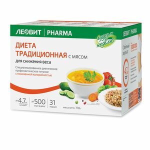 Комплексная программа питания ЛЕОВИТ «Худеем за неделю – Традиционное меню с мясом» поможет очистить организм от токсинов, уменьшить аппетит и быстро избавиться от лишнего веса благодаря эффективному жиросжигающему комплексу. Мы всё сделали за вас – подобрали ингредиенты, посчитали калории и разработали полезный и вкусный рацион на 5 дней. Как раз хватит на рабочую неделю. Мы также подготовили рекомендации, как питаться на 6-й и 7-й день программы, чтобы закрепить полученный результат – их вы найдёте в коробке с курсом.Худеем за неделю – это:Сбалансированный рацион. Гармоничное сочетание белков и углеводов с ограниченным содержанием жиров. В составе блюд есть витамины, минералы и другие необходимые для похудения биологически активные вещества.Безопасное снижение веса. Разработанный экспертами с 20-летним опытом состав помогает активизировать обмен веществ и процессы жиросжигания, контролировать аппетит, снизить тягу к сладкому.Простое соблюдение режима питания. Продукты распределены по дням и компактно упакованы. Их всегда можно взять с собой, чтобы придерживаться диеты в дороге или на работе.Повышение уровня энергии и общего тонуса организма. Тратьте меньше времени на готовку и получайте больше сил для новых свершений.Традиционное меню с мясом создано для тех, кто хочет придерживаться диеты, но не хочет менять вкусовые привычки. Разнообразное меню включает блюда русской кухни, которые позволят худеть с комфортом и любимым вкусом. Блюда содержат высококачественный животный и растительный белок, витамины, микроэлементы, антиоксиданты и ценные пищевые волокна.Как работает комплекс «Худеем за неделю – Традиционное меню с мясом»?Помогает сжигать лишнее. Блюда содержат специально разработанный жиросжигающий комплекс на основе эффективных компонентов – L-карнитина, экстракта гарцинии камбоджийской, пиколината хрома, инулина, корицы, куркумы, кардамона, имбиря, витамина C.Способствует уменьшению аппетита. Пищевые волокна, пиколинат хрома и гидроксилимонная кислота в составе экстракта гарцинии камбоджийской дарят чувство насыщения и способствуют снижению аппетита.Очищает организм. Содержит столбики с рыльцами кукурузы, сельдерей, лист толокнянки, магний, лист сенны, пищевые волокна и кориандр.Регулирует пищеварение. Блюда содержат столбики с рыльцами кукурузы, сельдерей, лавровый лист, кориандр, пищевые волокна, витамины и минералы.Помогает сформировать привычки здорового питания. Программа сформирована так, чтобы вам было легко сформировать полезные привычки и придерживаться их после окончания курса. Для этого в программе предусмотрен обязательный завтрак, дробный приём пищи, небольшие порции и полезный вечерний перекус за 2 часа до сна.Меню программы сбалансировано и разработано так, что каждое блюдо помогает справиться с отдельной задачей. Полный рацион вы можете увидеть на фото. Вы также можете дополнить рацион зеленью, свежими овощами и другими лёгкими продуктами общей калорийностью не более 500 ккал в день.