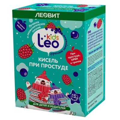 ЛЕОВИТ LEO KIDS КИСЕЛЬ ДЛЯ ДЕТЕЙ ПРИ ПРОСТУДЕ — специализированный пищевой продукт диетического лечебного и диетического профилактического питания для детей от одного года (сухой порошок) Пищевая ценность (средние значения) в 100 г сухого продукта / в одной порции (12 г) / % от суточной нормы: углеводы, г — 91,3/11/6, витамин С, мг — 417/50/111, энергетическая ценность, кДж (ккал) -1560 (370)/187 (44)/3 Витамины и лекарственные травы в составе вкусного натурального киселя помогут малышу быстрее справиться с симптомами простудных заболеваний: кашлем, насморком, головной болью, заложенностью носа, слабостью. Компоненты продукта оказывают болеутоляющее, противовоспалительное, антисептическое действие, снижают температуру: — витамин C укрепляет иммунитет, выводит из организма токсины — мать-и-мачеха оказывает смягчающее и отхаркивающее действие, способствует уменьшению кашля — ромашка обладает противовоспалительным, тонизирующим действием — корень девясила способствует отхождению мокроты — смородина чёрная оказывает общеукрепляющее действие — малина обладает противовоспалительным и болеутоляющим действием, снижает температуру — корень солодки обладает бронхолитическим, противолихорадочным действием В основе каждого киселя для детей от года Leo Kids уникальный сбор лекарственных трав, безопасность и эффективность которого доказаны клинически. Продукт разработан российскими специалистами в области диетологии и нутрициологии и рекомендован педиатрами России.