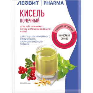 Кисель Почечный — это специализированный пищевой продукт диетического профилактического питания для снижения риска развития заболеваний почек и мочевыводящих путей. Напиток оказывает благотворное воздействие на функциональное состояние почек и мочевыделительной системы.Продукт рекомендован при лечении инфекций мочевого пузыря (цистита, уретрита и др.) и почек, нефрологии. Диета — это основа терапии при болезнях почек. Кисель ЛЕОВИТ применяется в качестве диетотерапии при комплексном лечении воспалительных заболеваний мочевой системы в период реконвалесценции и ремиссии, является мерой повышения эффективности базовой терапии. Продукт оказывает противовоспалительное действие, мочегонное действие (без вымывания калия и натрия), снижает диспепсические явления, дизурический и болевой синдром, улучшает показатели мочи, снижает риск рецидива. Напиток оказывает обволакивающее и заживляющее действие, восстанавливает микрофлору. Продукт имеет клинически подтвержденную эффективность.Лист брусники применяется в качестве мягкого мочегонного, антисептического и противовоспалительного средства, повышает эффективность антибиотиков, способствует улучшению минерального обмена веществ при камнях в почках, мочевом пузыре и подагре, способствует устранению отеков, восстанавливает оптимальный уровень кислотности мочевыделительной системы, что препятствует развитию патогенных микроорганизмов.Горец птичий уменьшает кристаллизацию минеральных солей в мочевыводящих путях, увеличивает выделение из организма натрия и хлора, обладает выраженными антитоксическими свойствами, способствует отхождению конкрементов при камнях в почках, мочевом и желчном пузыре.Толокнянка обладает противовоспалительными, противомикробными действиями. Содержит полифенол арбутин, который, являясь гликозилированным гидрохиноном, до 75% которого выводится с мочой, обеспечивает антимикробное действие в мочевыводящих путях.