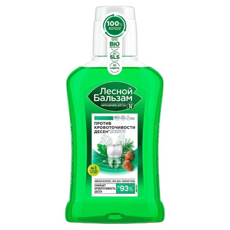 Профилактический ополаскиватель для полости рта Лесной бальзам на отваре трав обладает иммуноактивным действием, помогает решить проблему кровоточивости десен и в 2 раза улучшает работу собственного иммунитета полости рта, снижая риск развития проблем с деснами*. Клинически-доказанный эффект: • С первого применения улучшает состояние десен* • До 94% снижает кровоточивость десен при регулярном использовании** • В 5 раз снижает скорость образования налета на зубах, уменьшая бактериальную нагрузку на мягкие ткани полости рта** • не нарушает баланс микрофлоры полости рта Особенности состава: Насыщенный хвойный вкус. Содержит хвойных комплекс (на основе экстрактов пихты, живицы, можжевельника) с отваром 5 целебных трав, экстрактом коры дуба и соком алоэ. Такой сбалансированный состав способствует укреплению кровеносных сосудов десен, улучшает кровообращение и питание в мягких тканях полости рта, препятствует повторному возникновению кровоточивости при чистке зубов. Рекомендации: • Ополаскиватель одобрен Стоматологической Ассоциацией России и рекомендован в качестве профилактического средства при воспалении и кровоточивости десен (гингивите, пародонтите). • Использовать после каждой чистки зубов, а также после еды для очищения межзубных промежутков. Наполните колпачок ополаскивателем и тщательно прополощите полость рта в течение 30 секунд. • Не требуется полоскать после использования водой. • При кровоточивости десен рекомендуется использовать совместно с зубной пастой Лесной бальзам после каждой чистки зубов, а также тщательно полоскать полость рта после каждого приема пищи. В период ремиссии сохранить использование минимум 1 раз в день для предупреждения развития проблем десен и улучшения питания мягких тканей полости рта. • Подходит для использования в ирригаторе. • Подходит для использования в период беременности и лактации *Лесной бальзам поддерживает иммунитет и усиливает эффективность работы естественных защитных функций полости рта. Свойства подтверждены клиническими испытаниями РФ, 2016 — 2017. **При совместном использовании зубной пасты и ополаскивателя Лесной бальзам на основе хвойного комплекса с отваром трав согласно клиническим испытаниям, через 1 месяц использования, Россия 2017