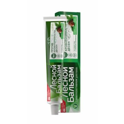 Профилактическая зубная паста Лесной бальзам c иммуноактивным действием помогает решить проблему кровоточивости десен и в 2 раза увиливает местный иммунитет полости рта, снижая риск развития проблем с деснами*. Клинически-доказанный эффект: — С первого применения улучшает состояние десен* — До 94% снижает кровоточивость десен при регулярном использовании** — В 5 раз снижает скорость образования налета на зубах, уменьшая бактериальную нагрузку на мягкие ткани полости рта** Особенности состава: Формула зубной пасты при кровоточивости десен на 93% состоит из компонентов натурального происхождения, имеет насыщенный вкус хвойных масел в сочетании с мятной свежестью. Содержит хвойных комплекс (на основе экстрактов пихты, живицы, можжевельника) с отваром 5 целебных трав и экстрактом коры дуба. Богатый натуральный состав способствует укреплению кровеносных сосудов десен, улучшает кровообращение и питание мягких тканей полости рта, препятствует повторному возникновению кровоточивости при чистке зубов. Зубная паста изготовлена на отваре 5 трав (ромашка, тысячелистник, крапива, зверобой, чистотел). Отвар трав используется взамен обычной воды и получается в результате низкотемпературной экстракции (35%), что позволяет достичь максимально полного переноса ценных веществ из растений в отвар. Зубная паста бережно очищает эмаль за счет природного абразива — диоксида кремния (Silica). Диоксид кремния не царапает эмаль в процессе чистки зубов, при этом позволяет добиться равномерного удаления налета по всей поверхности зубов. Зубная паста содержит фтор на уровне 1000 ppm, что соответствует среднему уровню содержания фторидов и подходит для ежедневной защиты эмали от кариеса. Рекомендации: Зубная паста при кровоточивости десен одобрена Стоматологической Ассоциацией России и рекомендована в качестве профилактического средства при появлении проблем десен (гингивит, пародонтит). Использовать минимум 1 раз в день, вечером, для укрепления десен. *Свойства подтверждены клиническими испытаниями РФ, 2016-2017. **При совместном использовании зубной пасты и ополаскивателя Лесной бальзам на основе хвойного комплекса с отваром трав согласно клиническим испытаниям, через 1 месяц использования, РФ 2017 Не является лекарственным средством. Применение не освобождает от посещения стоматолога.