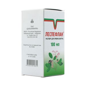 Показания к применениюХроническая почечная недостаточность различного происхождения, в латентной компенсированной и интермиттирующей стадиях (в составе комбинированной терапии).Применение при беременности и кормлении грудьюПротивопоказана при беременности, в период лактации.ПротивопоказанияИндивидуальная непереносимость компонентов Леспефлана. Беременность.Побочное действиеВозможно: аллергические реакции, гипонатриемияСоставВ 100 мл раствора содержится: побеги леспедезы двухцветной 70.8 г; этанол (спирт этиловый) 95%; вода очищенная; аниса маслоВзаимодействие с другими препаратамиВ связи с наличием алкоголя нельзя назначать препарат больным, получающим лечение препаратами, угнетающими центральную нервную систему, инсулином, гипогликемическими средствами (метформин, производные сульфонилмочевины); лекарственными средствами, вызывающими непереносимость алкоголя (дисульфирамоподобное действие).