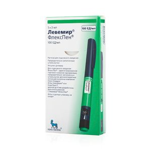 Показания к применениюСахарный диабет у взрослых, подростков и детей старше 2 лет.Применение при беременности и кормлении грудьюВ настоящее время отсутствуют данные клинического применения инсулина детемир при беременности и в период лактации. В период возможного наступления и в течение всего срока беременности необходимо вести тщательное наблюдение за состоянием пациенток с сахарным диабетом и контролировать уровень глюкозы в плазме крови. Потребность в инсулине, как правило, снижается в I триместре и постепенно повышается во II и в III триместрах беременности. Вскоре после родов потребность в инсулине быстро возвращается к уровню, который был до беременности. В период грудного вскармливания может возникнуть необходимость в коррекции дозы препарата и диеты. В экспериментальных исследованиях на животных не установлено различий между эмбриотоксическим и тератогенным действием инсулина детемир и человеческого инсулина.ПротивопоказанияПовышенная индивидуальная чувствительность к инсулину детемир или любому из компонентов препарата.Не рекомендуется применять препарат Левемир ФлексПен у детей в возрасте до 2 лет, т.к. клинические исследования у детей младше 2 лет не проводились.СоставДействующее вещество: Инсулин детемир (Insulin detemir*). Концентрация действующего вещества (од.): 100ЕД.Взаимодействие с другими препаратамиГипогликемическое действие инсулина усиливают пероральные гипогликемические препараты, ингибиторы МАО, ингибиторы АПФ, ингибиторы карбоангидразы, неселективные бета-адреноблокаторы, бромокриптин, сульфонамиды, анаболические стероиды, тетрациклины, клофибрат, кетоконазол, мебендазол, пиридоксин, теофиллин, циклофосфамид, фенфлурамин, препараты лития, препараты, содержащие этанол. Гипогликемическое действие инсулина ослабляют пероральные контрацептивы, ГКС, тиреоидные гормоны, тиазидные диуретики, гепарин, трициклические антидепрессанты, симпатомиметики, даназол, клонидин, блокаторы медленных кальциевых каналов, диазоксид, морфин, фенитоин, никотин. Под влиянием резерпина и салицилатов возможно как ослабление, так и усиление действия инсулина детемир. Октреотид/ланреотид может как повышать, так и снижать потребность организма в инсулине. Бета-адреноблокаторы могут маскировать симптомы гипогликемии и задерживать восстановление после гипогликемии. Этанол может усиливать и пролонгировать гипогликемический эффект инсулина.Фармацевтическое взаимодействиеНекоторые лекарственные средства, например, содержащие тиол или сульфит, при добавлении к инсулину детемир, могут вызывать разрушение инсулина детемир.