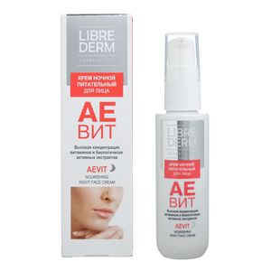 АЕВИТ крем питательный ночной 50 млОбладает выраженным омолаживающим действием: питает, тонизирует, повышает эпидермальную регенерацию, препятствует преждевременному старению кожи, защищает клетки от воздействия свободных радикалов.Крем питательный ночной создан для полноценного ночного ухода за кожей лица, шеи и области декольте. Содержит высокую концентрацию витаминов и биологически активных растительных экстрактов облепихи, льна, чабреца и календулы. Обладает выраженным омолаживающим действием: питает, тонизирует, повышает эпидермальную регенерацию, препятствует преждевременному старению кожи, защищает клетки от воздействия свободных радикалов.Активные ингредиенты[+] Синергия витаминов А и Е.Обеспечивает мощное антиоксидантное воздействие, защищает клетки от повреждений и старения, ускоряет процессы регенерации, стимулирует синтез коллагена, восстанавливает эластичность.[+] Масло облепихи.Разглаживает мелкие морщины, прекрасно питает, увлажняет и регенерирует, предотвращает преждевременное старение клеток.[+] Масло льна.Смягчает и успокаивает кожу.[+] Экстракт календулы.Тонизирует и увлажняет.[+] Масло виноградной косточки.Повышает упругость кожи.ТекстураНежная, приятная кремовая текстура с приятным ароматом, быстро впитывается, не оставляет следов. Без эффекта пленки.РезультатВосстановленная кожа, насыщенная витаминами.